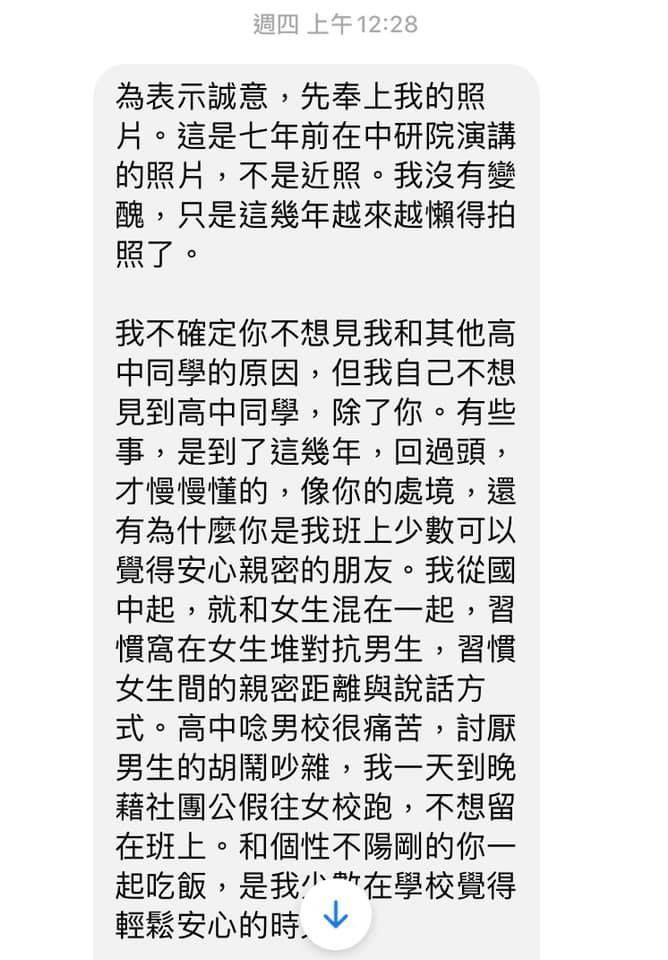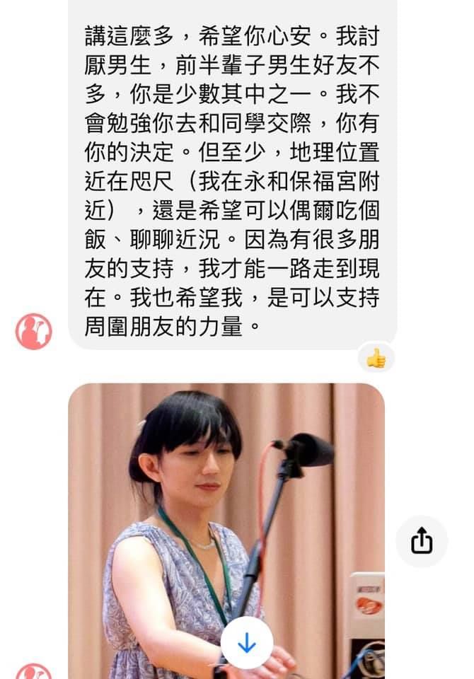 講這麼多,希望你心安。我討厭男生,前半輩子男生好友不多,你是少數其中之一。我不會勉強你去和同學交際,你有你的決定。但至少,地理位置近在咫尺(我在永和保福宮附近),還是希望可以偶爾吃個飯、聊聊近況。因為有很多朋友的支持,我才能一路走到現在。我也希望我,是可以支持周圍朋友的力量又