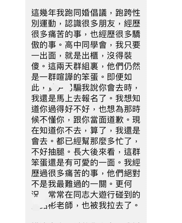 這幾年我跑同婚倡議,跑跨性別運動,認識很多朋友,經歷很多痛苦的事,也經歷很多驕傲的事。高中同學會,我只要一出面,就是出櫃,沒得裝傻。這兩天群組裏,他們仍然是一群喧譁的笨蛋。