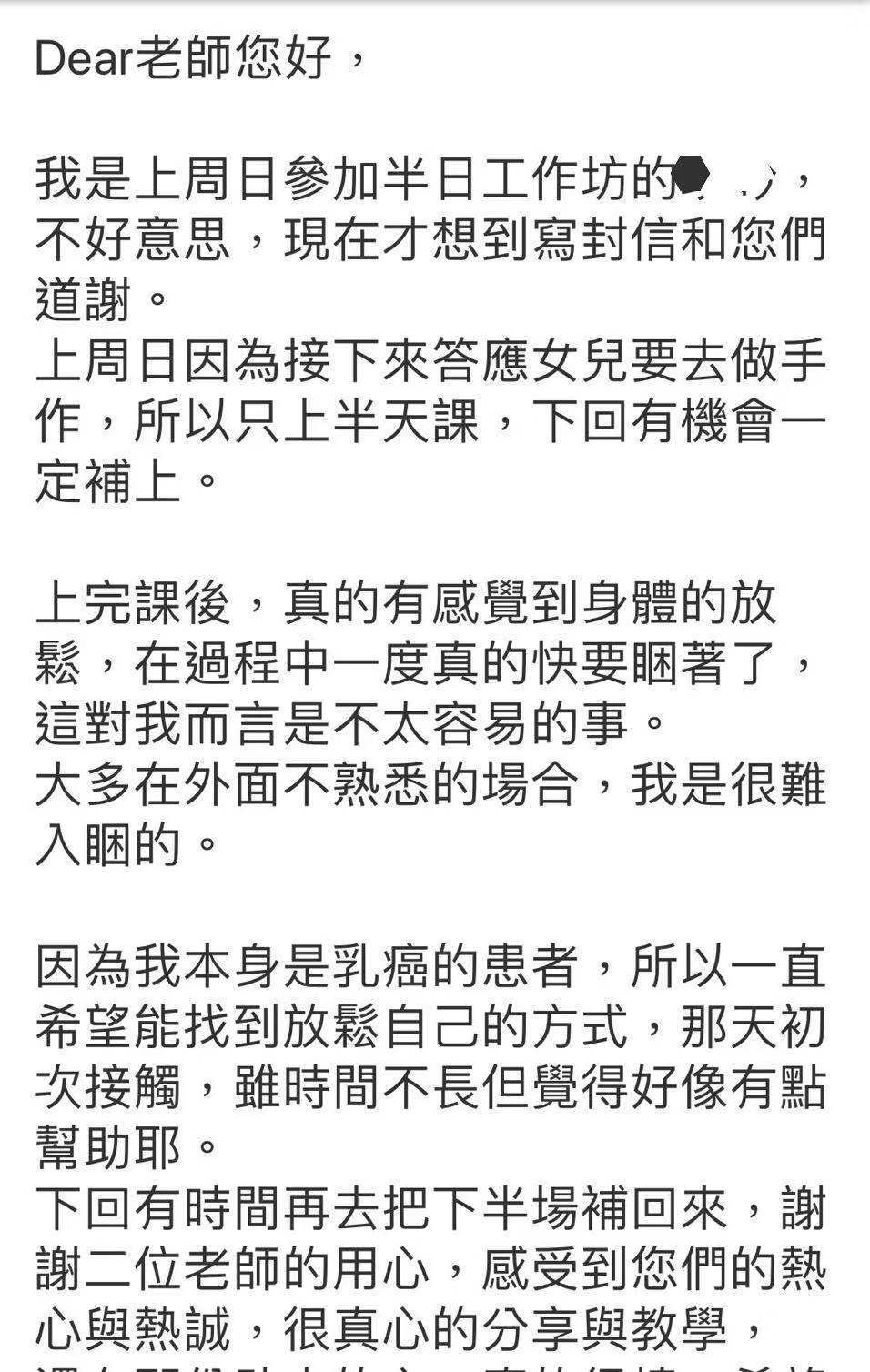 因為我本身是乳癌的患者,所以一直希望能找到放鬆自己的方式,那天初次接觸,雖時間不長但覺得好像有點幫助耶。