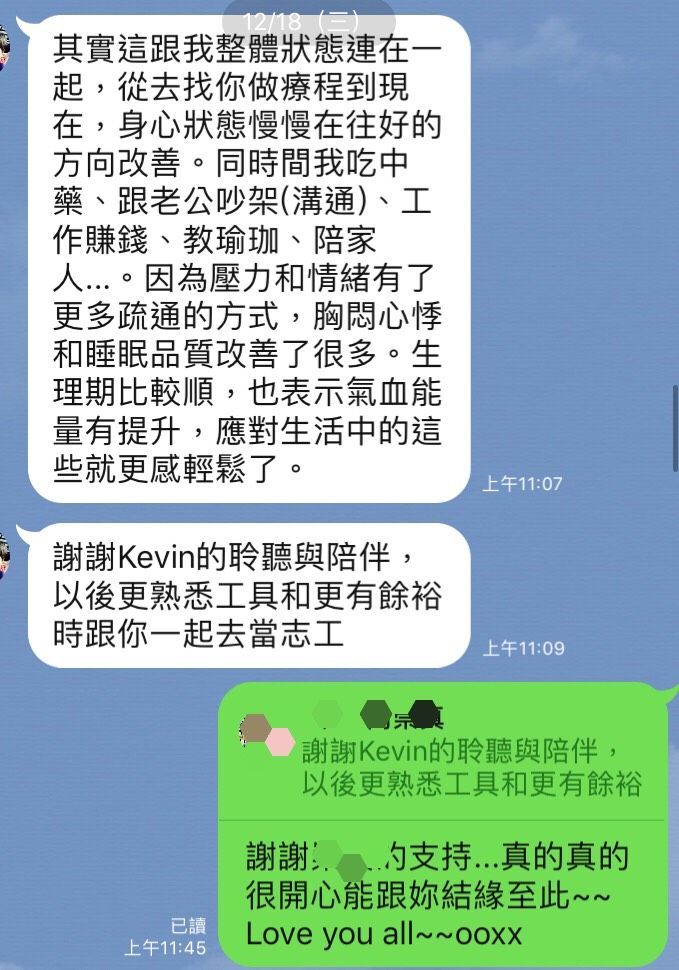 其實這跟我整體狀態連在一起,從去找你做療程到現在,身心狀態慢慢在往好的方向改善。同時間我吃中藥、跟老公吵架(溝通)、工作賺錢、教瑜珈、陪家人...。因為壓力和情緒有了更多疏通的方式,胸悶心悸和睡眠品質改善了很多。生理期比較順,也表示氣血能量有提升,應對生活中的這些就更感輕鬆了