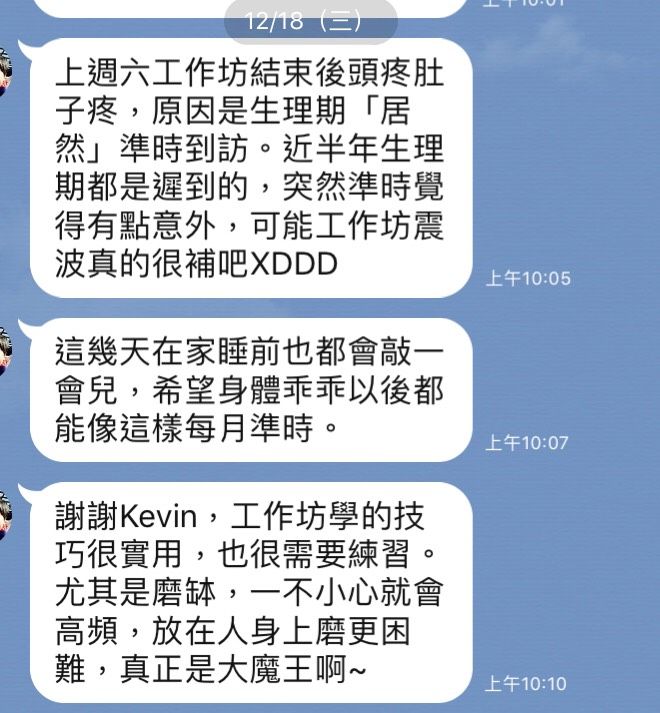 謝謝Kevin,工作坊學的技巧很實用,也很需要練習。尤其是磨缽,一不小心就會高頻,放在人身上磨更困難,真正是大魔王啊~