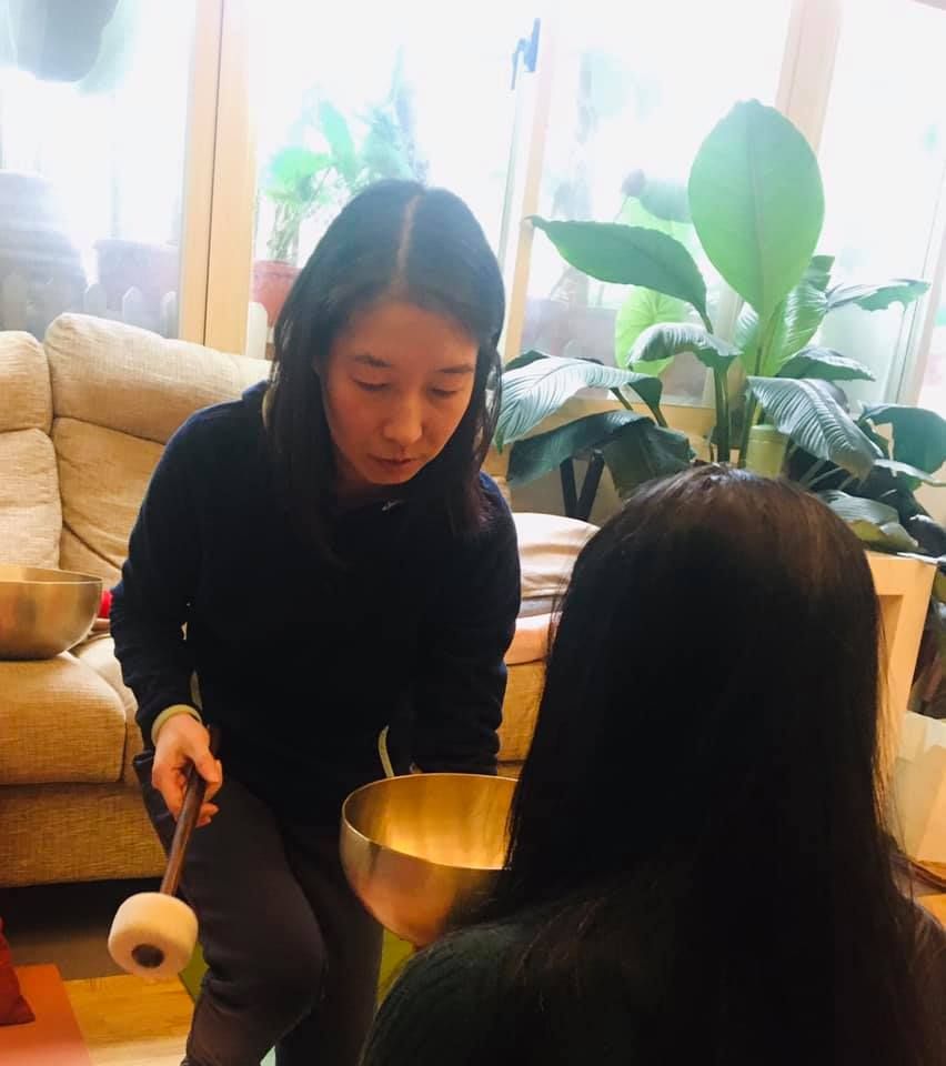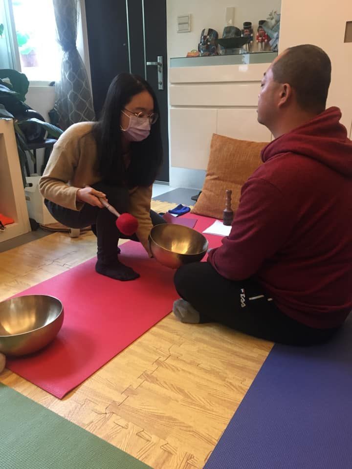 同學要掌握這個練習的重點注意事項: 包括缽離身體的位置遠近、敲缽的強弱掌握、甚至細膩到像是缽緣跟身體的角度都要注意,才能讓聽缽者感到舒服與放鬆。