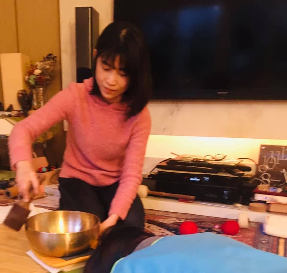 大概還有連結到天王星的創新能量與海王星的直覺力能量(自己說的),順著這位同學提出的問題,當場即興發揮就設計了一段完整的練習,主要是全程手持缽為夥伴以坐姿來清理氣場跟任督二脈的能量梳理。