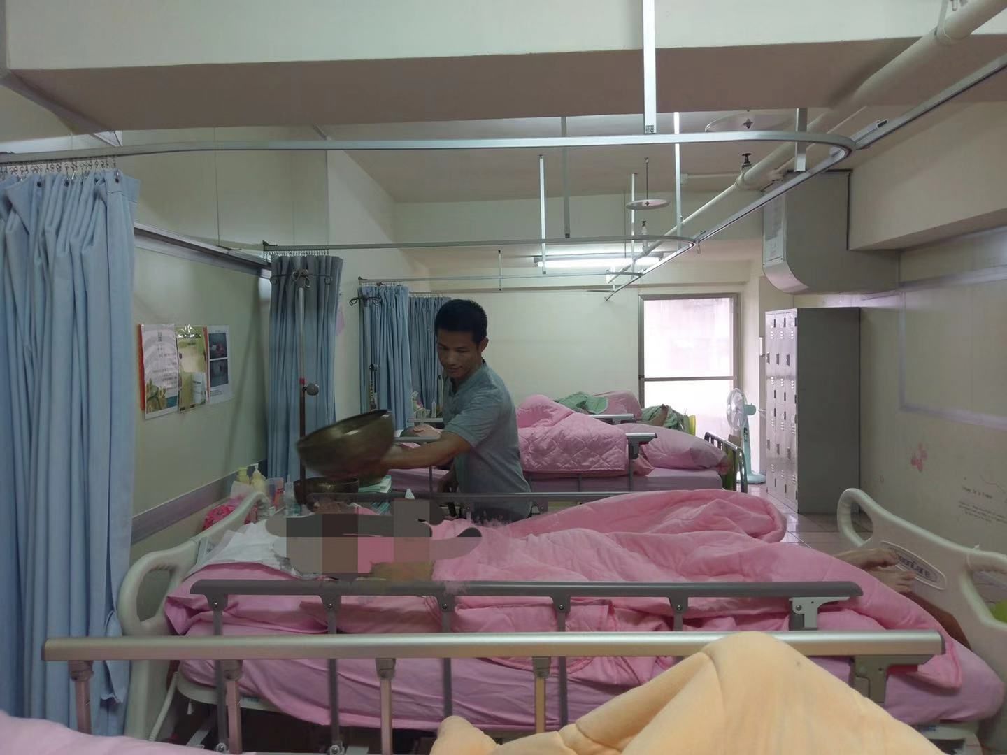 過了幾間房,我看到有一位有意識的院民竟然在聽缽之後在對我笑,我感到有點訝異卻帶著無比的驚喜,他的眼中真的是有光芒,微笑是如此自然與童真般的純粹,我感受到他很開心很快樂的心情,也回以所能給予最溫暖與感謝的微笑(照片上看起來好像還好),我就這樣一邊敲一邊感受他笑容中所帶的快樂,他笑我也笑。這當下是我敲缽以來最感動最感動的一刻,這一刻代表的意義如此深遠。