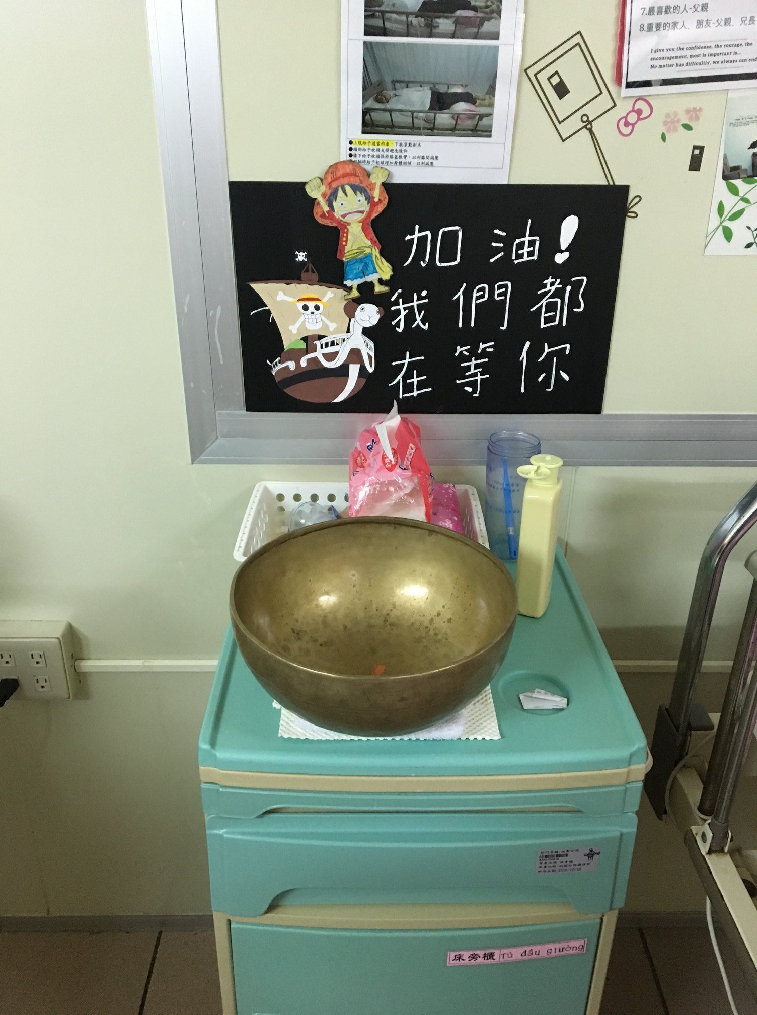 如同往常一般帶著敬重的心情為敲缽做準備,這次來仍是大大小小一大行李箱,絕不因是為植物人敲缽而馬虎行事,依舊希望能讓每一位聽缽者有一顆缽很近身地陪伴著,規格沒有絲毫打折。