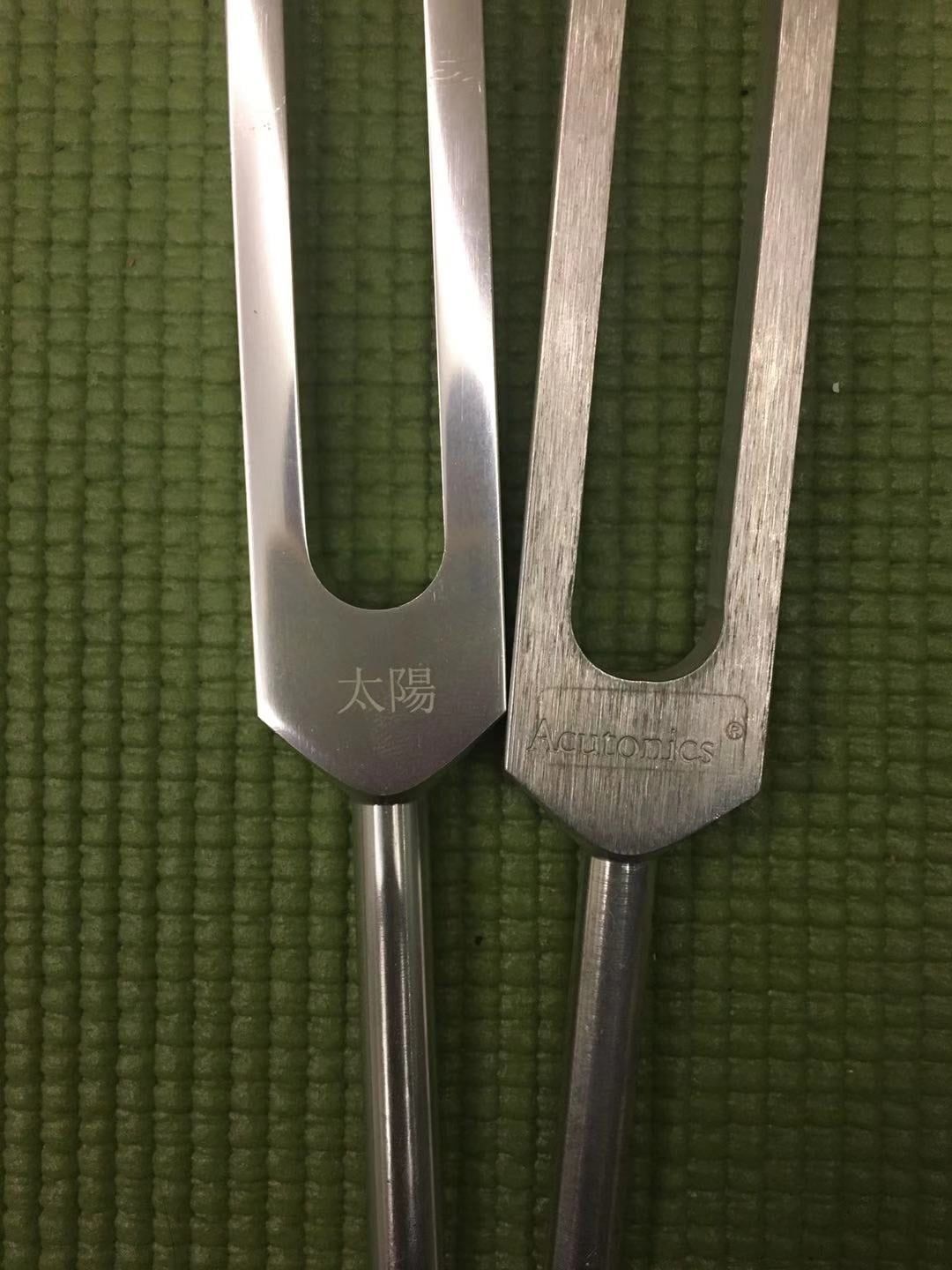 音叉這工具其實不是太難製造,市面上也已經很多脈輪音叉可供購買,當然自已也必須找到廠商幫忙客制特定的頻率,且有刻字,外觀上是完全不同的(附件8.),使用的音叉在任何的場合、文章內容完全沒有聲稱跟Acutonics的音叉有任何的關聯、或意圖引導/誤導至這個方向。我相信Acutonics的音叉材料品質更好,但就像老缽和新缽是類似的意思,重要的是聲波的頻率,並不是好聽的比較。
